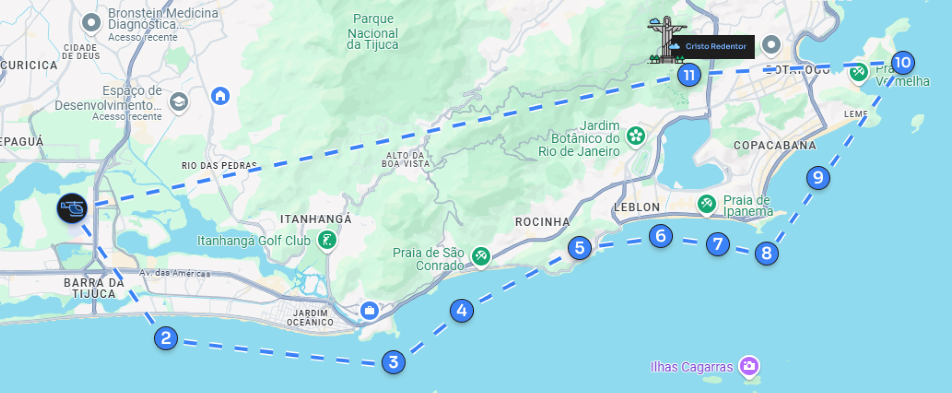 Em 25 minutos de voo, você vai além dos clássicos e sobrevoa praias paradisíacas como Barra da Tijuca, Joatinga, São Conrado, Leblon e Ipanema. No mesmo trajeto, ainda contempla o Vidigal, o Arpoador, Copacabana e fecha com chave de ouro passando pelo Pão de Açúcar e Cristo Redentor.